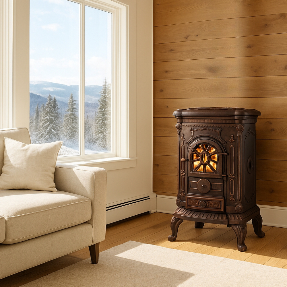 Przytulny ciepły dom na wyciągnięcie ręki! Kominek Ambra w kolorze złotym został wykonany z wysokiej jakości odlewu żeliwnego o imponującej grubości 11 mm, co gwarantuje długie utrzymywanie ciepła oraz niezawodne działanie przez lata. Z mocą grzewczą do 9 kW, spełniającą normy Ekoprojektu, świetnie sprawdzi się w domach, domkach letniskowych i większych pomieszczeniach – ogrzewając nawet do 80 m². Łączy klasyczną formę z luksusowym wykończeniem, stając się sercem każdego pomieszczenia.